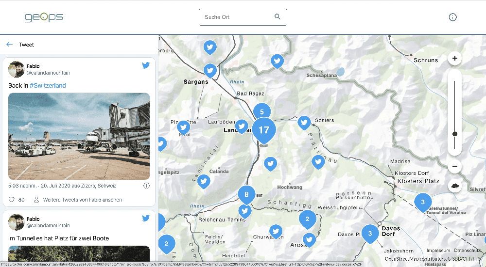 Das zweite große Projekt, womit ich mich gegen Ende meiner Praktikumszeit beschäftigen durfte, war Railview. Railview zeigt die Orte, an denen Fabio, ein leidenschaftlicher Lokführer der Rhätischen Bahn, die Fotos geschossen hat, die er in seinem Twitter-Account @calandamountain veröffentlicht.